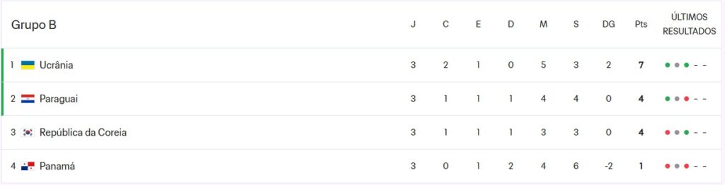- No Grupo B, a Ucrânia superou o Paraguai por 2 a 1 e garantiu a liderança. Apesar da derrota, os paraguaios também se classificaram em segundo. Já a Coreia do Sul, com quatro pontos, ainda depende dos resultados finais para avançar como terceiro.