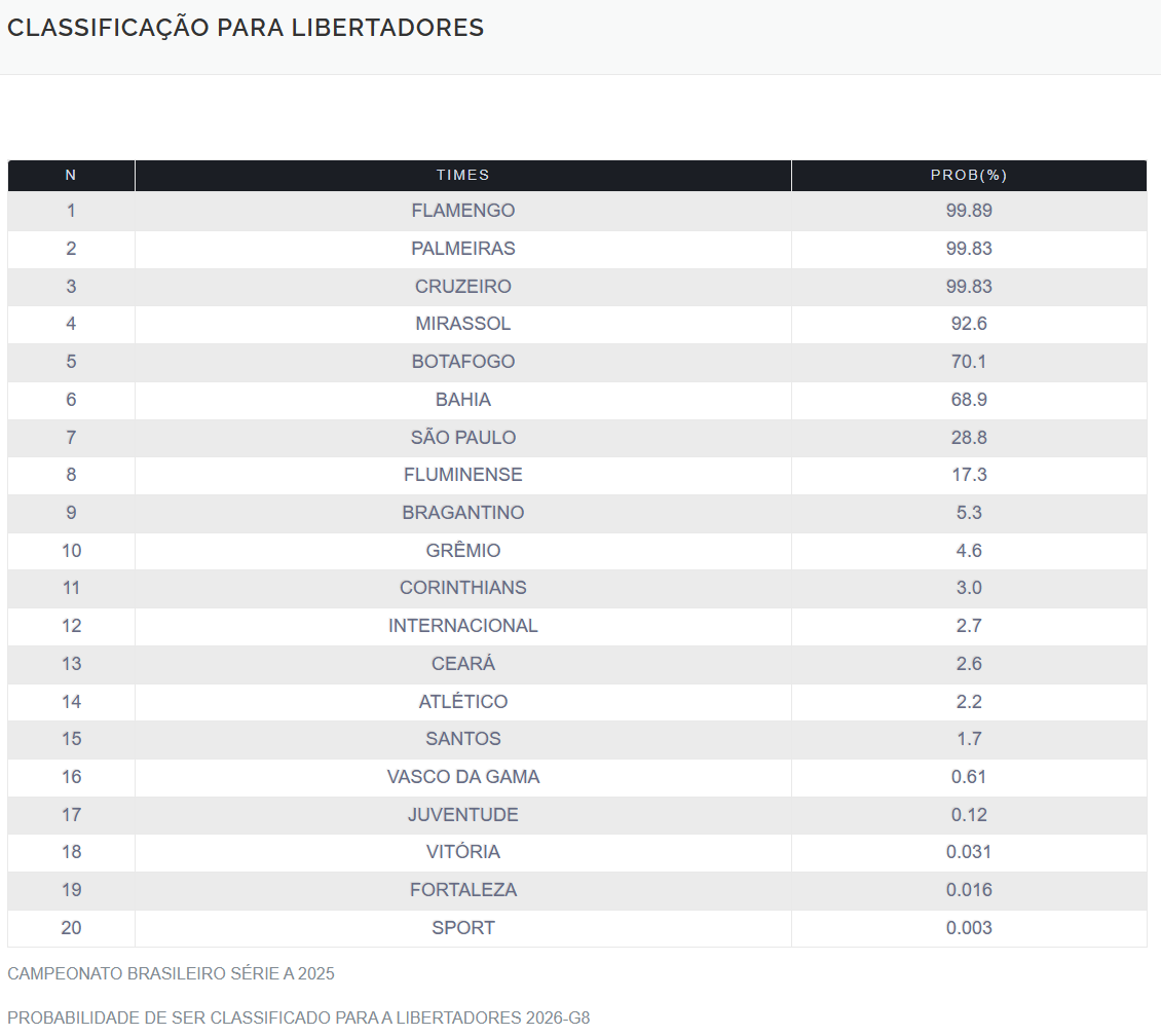 Quando se trata de vagas na Libertadores, o G-6 segue formado por Flamengo, Cruzeiro, Palmeiras, Mirassol, Botafogo e Bahia. Nesse grupo, o grande destaque foi o Mirassol, que derrotou o Juventude e saltou de 72,42% para 91,26% de chances de classificação. Já o São Paulo, que perdeu o clássico para o Santos, viu sua probabilidade despencar de 50,08% para 39,35%.