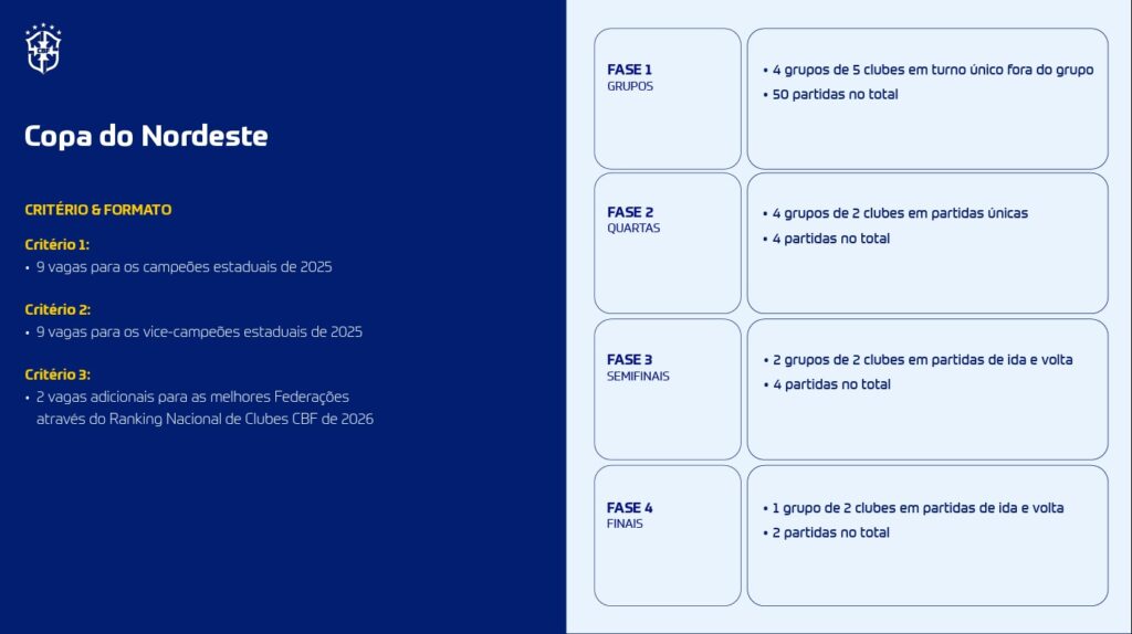 Logo depois, a Copa do Brasil cresce e terá 126 clubes em 2026 (e 128 em 2027). Todos os times da Série A entrarão apenas na 5ª fase, enquanto as vagas estaduais sobem de 80 para 102. No total, o torneio terá 155 partidas. Por fim, a decisão acontecerá em jogo único, no dia 6 de dezembro, em estádio com acesso fácil, rede hoteleira, capacidade mínima de 40 mil lugares e condições de receber duas torcidas. Portanto, a final se transformará em um grande evento esportivo, turístico e comercial.