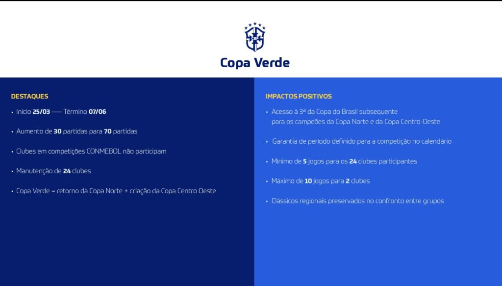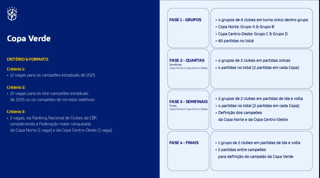 A Copa Verde terá novo formato, agora dividida em duas regiões: Copa Norte e Copa Centro-Oeste. Cada uma apontará um campeão, e ambos se enfrentarão na final. A Copa Norte retorna oficialmente, reunindo 12 clubes — dois por estado e uma vaga extra para a federação melhor ranqueada. O campeão da Copa Verde entrará na 3ª fase da Copa do Brasil.