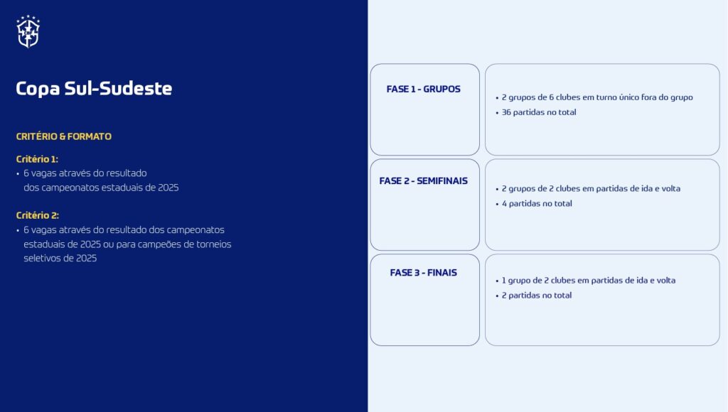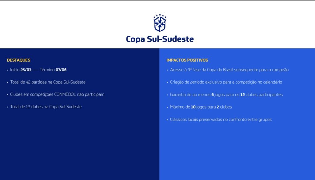Outra novidade é a Copa Sul-Sudeste, que terá 12 clubes de SP, RJ, MG, PR, RS e SC. A competição ocorrerá de 25 de março a 7 de junho. O campeão terá vaga na Copa do Brasil de 2027, e clássicos como Flamengo x Atlético-MG ou Corinthians x Grêmio poderão acontecer já nesse torneio.
