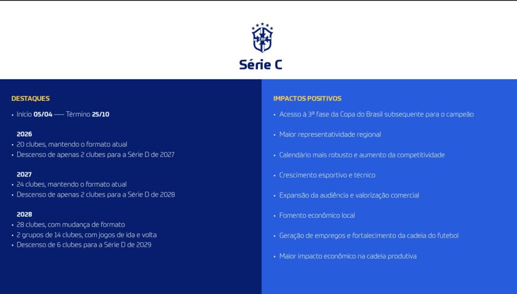 A Série C, em 2026, terá 20 clubes e o mesmo formato atual, mas em 2027 passará a contar com 24 times. Já em 2028, subirá para 28 equipes, divididas em dois grupos de 14, com jogos de ida e volta.