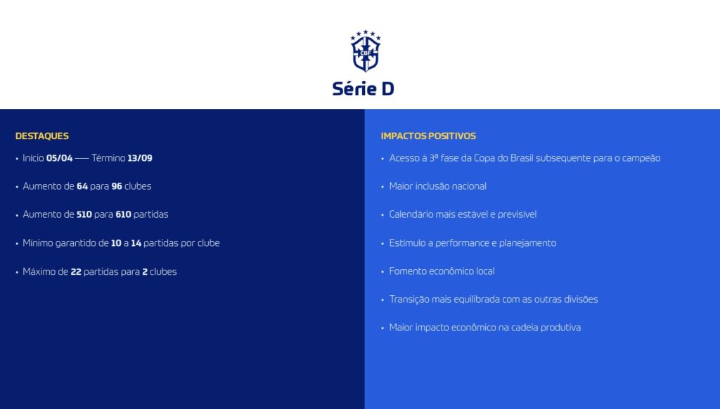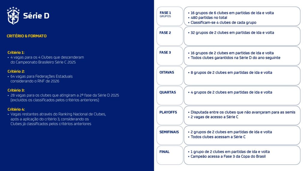 A Série D terá o maior salto: passará de 64 para 96 clubes, garantindo a presença de mais estados e equipes tradicionais. Serão 16 grupos de 6 times, com no mínimo 10 jogos para cada participante e, no máximo, 22 aos finalistas. Além disso, a CBF introduzirá playoffs de acesso, o que aumentará a competitividade. Ao todo, seis clubes sobem para a Série C, e o campeão garante vaga na 3ª fase da Copa do Brasil.