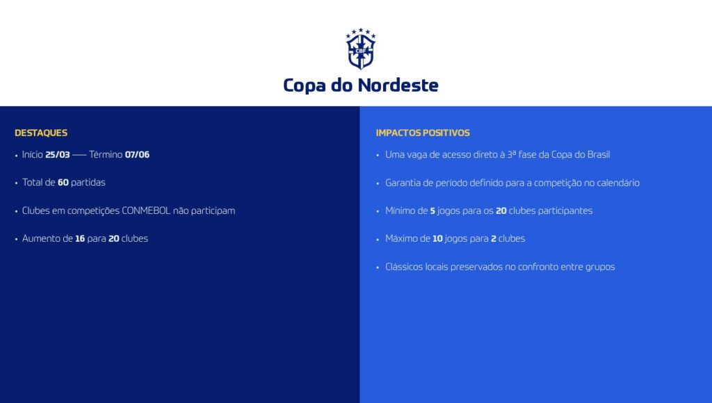 A tradicional Copa do Nordeste passa de 16 para 20 clubes e será disputada de 25 de março a 7 de junho. Apesar da redução de 13 para 10 datas, os clássicos regionais continuam garantidos. O campeão terá vaga na 3ª fase da Copa do Brasil.