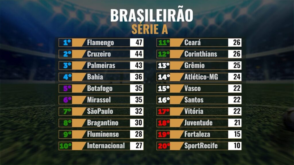 Antes de mais nada, vale destacar que o Flamengo segue tranquilo na liderança, somando 47 pontos. Logo atrás, aparece o Cruzeiro, vice-líder com 44 pontos, seguido pelo Palmeiras, que ocupa a terceira colocação com 43. Dessa forma, os três primeiros vivem um momento de estabilidade no G4 e não correm risco imediato de queda.
