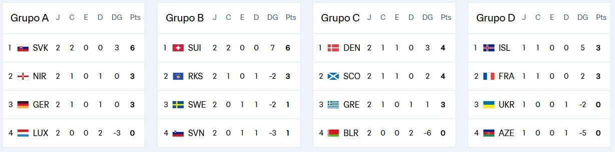 As Eliminatórias europeias ganharam um novo formato da Uefa. Serão 16 vagas diretas e, até aqui, todas seguem em aberto. Metade dos grupos já teve quatro rodadas, enquanto a outra metade estreia nesta Data Fifa.