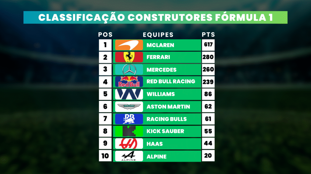 Em termos de equipes, a McLaren continua a ditar o ritmo; Red Bull e Ferrari, por sua vez, seguem na perseguição direta e alternam bons resultados conforme o traçado favorece um ou outro carro. Além disso, Mercedes e Williams aparecem como forças consistentes para pontuar regularmente, enquanto Sauber, Racing Bulls e Aston Martin travam disputa apertada no bloco intermediário.