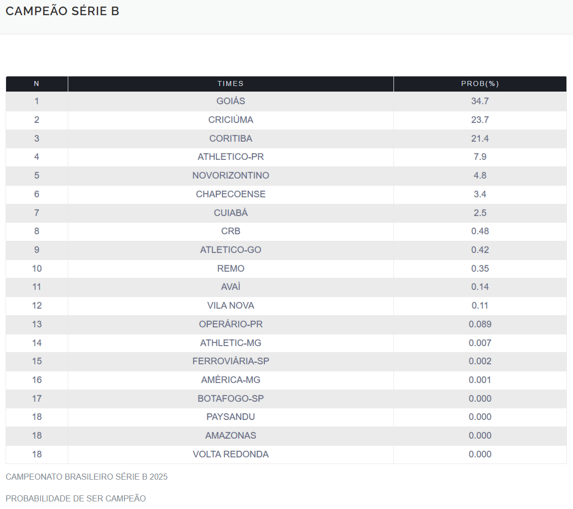 Na corrida pela taça, o Goiás lidera com 34,7% de chance de conquistar a Série B, seguido de Criciúma (23,7%) e Coritiba (21,4%). Mesmo fora do G-4, o Athletico-PR aparece com 7,9% de chance, reflexo da sequência positiva.
